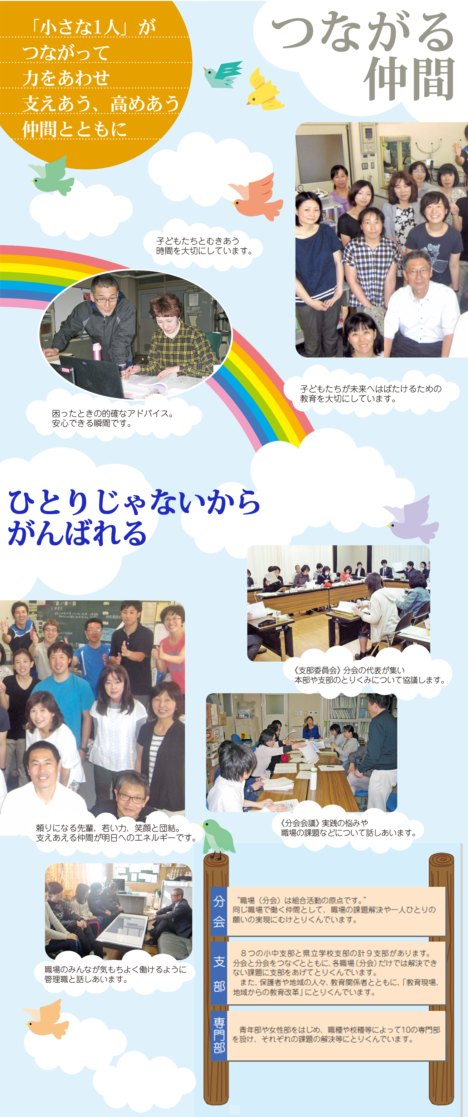 保護者や地域の人々、そして働く仲間とともに、さまざまな教育の課題について話しあい、地域とともに歩む学校づくりをめざします。